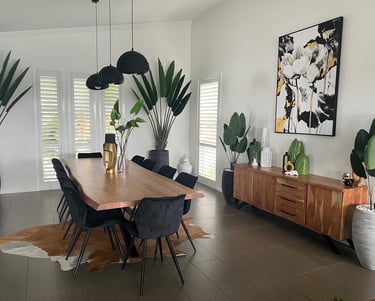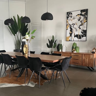 The wooden live-edge table, along with the matching buffet, brings a sense of warmth and character to the room. To enhance the ambiance, we removed the crystal chandelier that was originally positioned above the dining table and replaced it with three organic shaped pendant lights, in the new position. This change creates a more intimate dining experience, perfect for cosy gatherings. Additionally, we incorporated LED downlights to provide adequate task lighting whenever needed. The combination of the natural wooden elements, the organic pendant lights, and the functional downlights add a touch of elegance and functionality to the space.