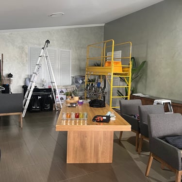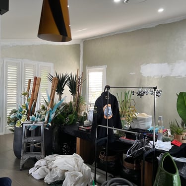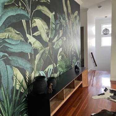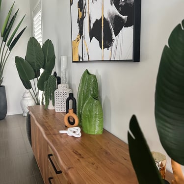To further enhance the overall design, we decided to make use of two of the old pots and incorporated new artificial bird of paradise plants into them. In order to achieve a harmonious balance within the room and its high ceilings, we also introduced two new large pots filled with beautiful traveller palms. To tie everything together, we included accents of black, green, and gold in the artwork and decor. This combination of colours adds a touch of elegance and cohesiveness to the entire room.