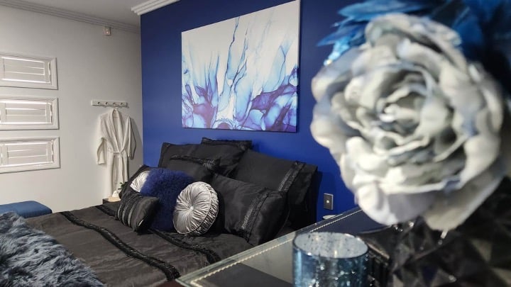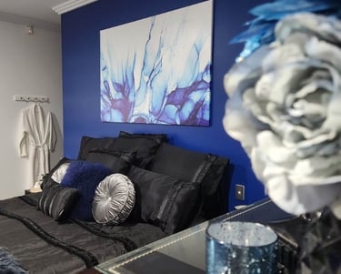 Artwork was carefully selected to enhance the overall aesthetic, and to complement this, we incorporated black satin bed linen with silver accents for a touch of sophistication. To add another layer of texture, a deep blue faux fur throw and cushion were added to the bed. We recovered the ottoman with blue upholstery fabric to tie in with the overall colour scheme. In order to create a neater and more organized space, trays were placed on the bedside tables to hold lamps and small decorative items. We also enlisted the help of an electrician to replace the outdated silver downlights with white rimmed LED lights, as well as installing a powerpoint behind the wall mounted TV to hide any cables. In the ensuite, we ensured a thorough cleaning and provided high-quality navy Egyptian cotton bath sheets, hand towels, and bath mats for added comfort. Decorative navy pots with artificial plants, as per the client's request, were placed around the spa, along with candles to create a cozy atmosphere. To complete the look, navy and white soap dispensers were added.