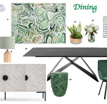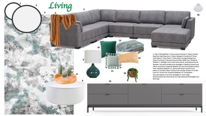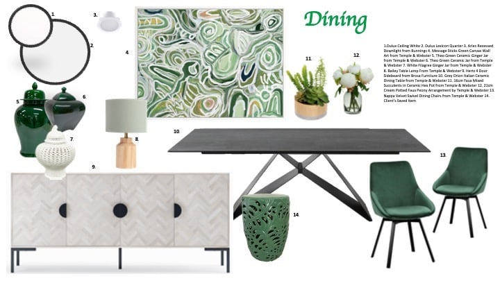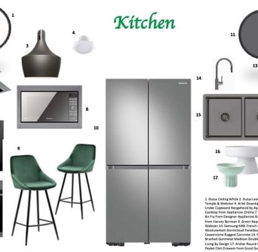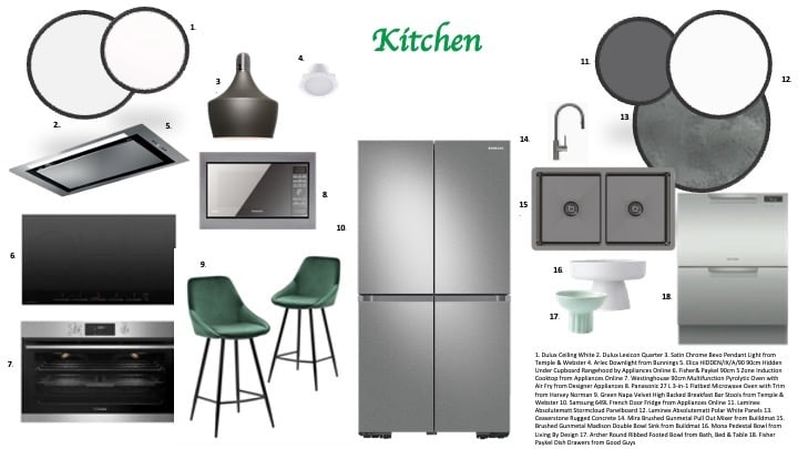 The client had a specific request for the colour scheme of the design, and we agreed on using mainly neutral colours and greys. We suggested incorporating green (the clients favourite colour) as the accent colour to bring some vibrancy and liveliness to the overall design. To give the client a visual representation of the design, we presented a sample boards that showcased the selected fixtures, fittings, and equipment. This allowed the client to have a clear understanding of how the final design would look like. We also provided a Schedule of Specifications giving the clients their own personalised shopping list for each room.