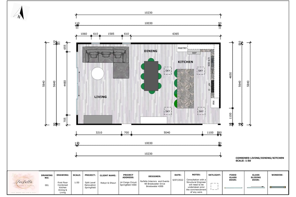 We carefully created a floor plan in accordance with the client's requirements, which involved removing the rear window to make space for the relocated kitchen, and removing a wall which divided the living from the kitchen and dining areas.