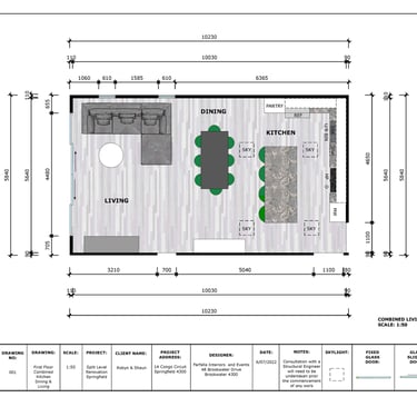 The clients for this project are a working couple with an adult son who still lives at home and works full time. They wanted to transform the current area by creating an open living, dining, and kitchen space. Additionally, they wanted to relocate the kitchen to the rear of the area and increase the amount of storage available.